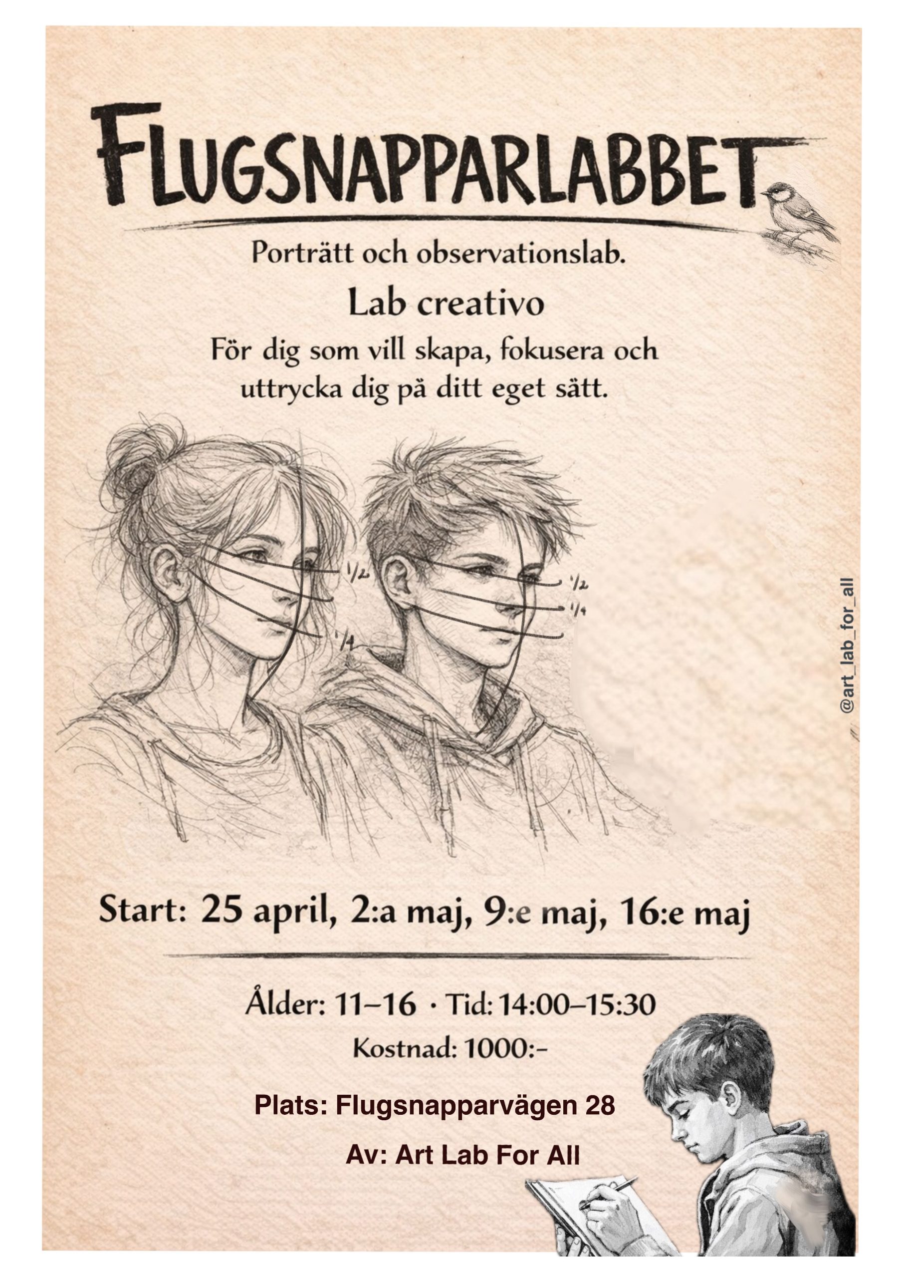 I detta kreativa laboratorium får du utforska porträttteckning på ett lekfullt och inspirerande sätt. Vi kommer att arbeta med att se, mäta och förstå ansiktets proportioner, men också experimentera med linjer, former och skuggor för att skapa egna uttryck.